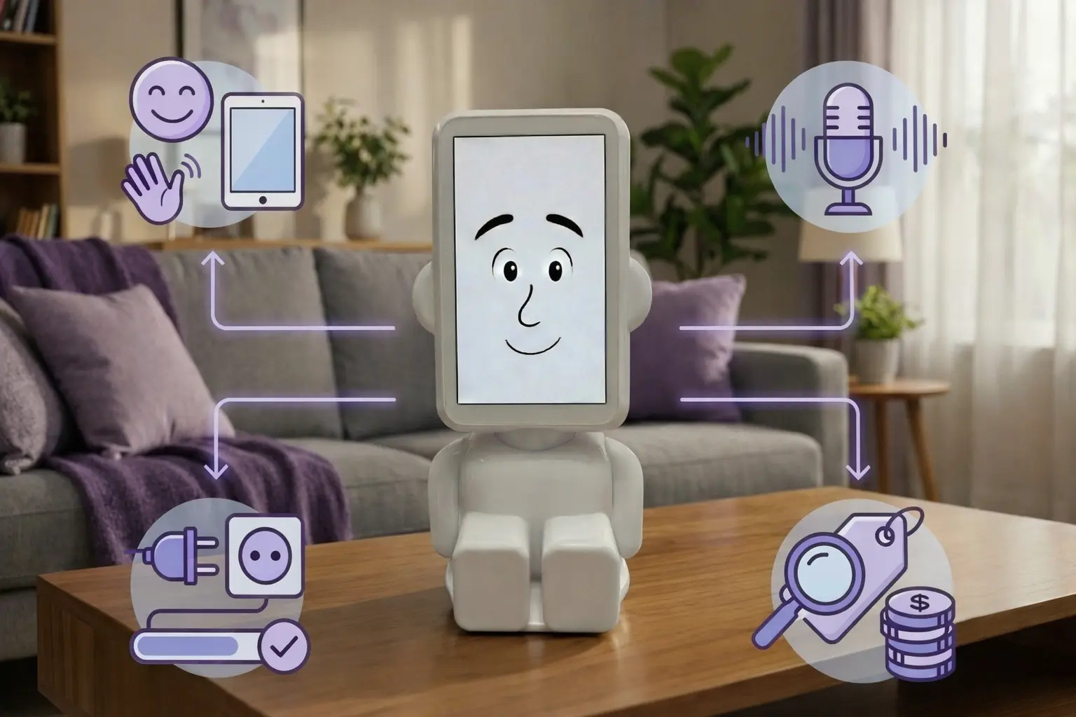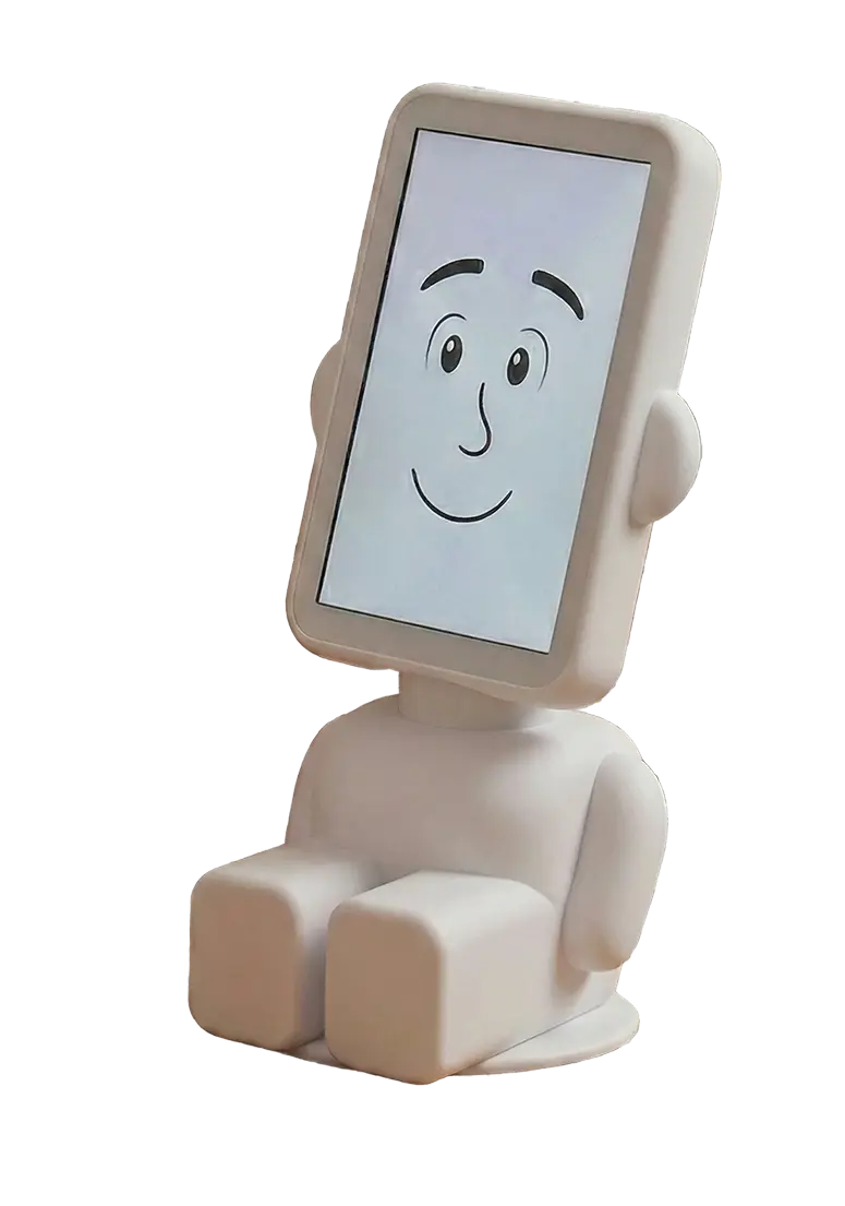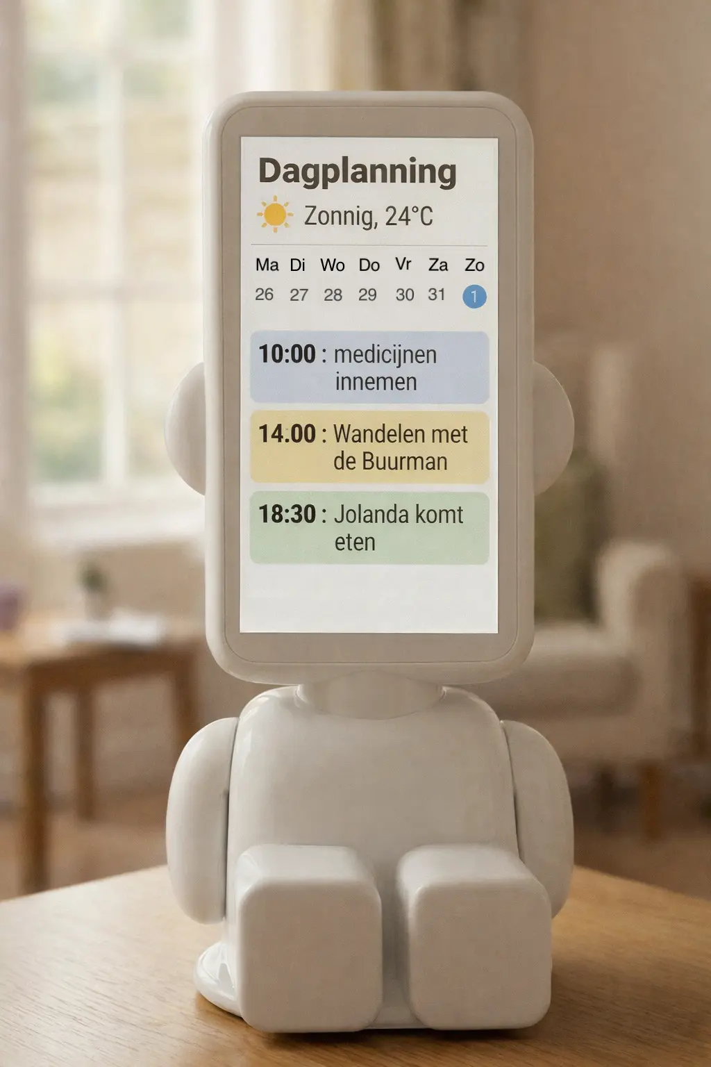Het device is een tablet met volledig spraakgestuurde interface. Geen ingewikkelde menu's of knoppen. De gebruiker hoeft niets te typen of te leren.